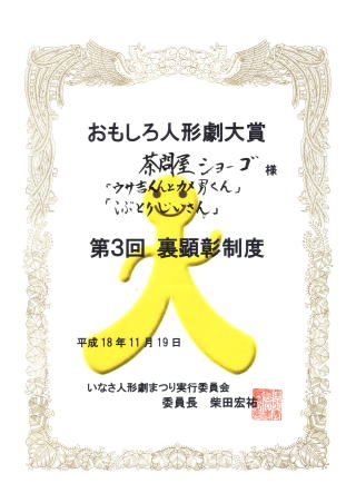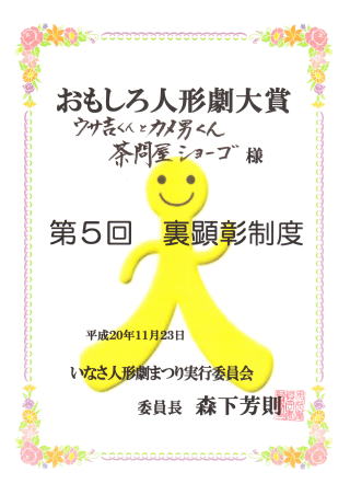 | 平成18年、20年 「こぶとりじいさん」「ウサ吉くんとカメ男くん」 おもしろ人形劇大賞受賞! |