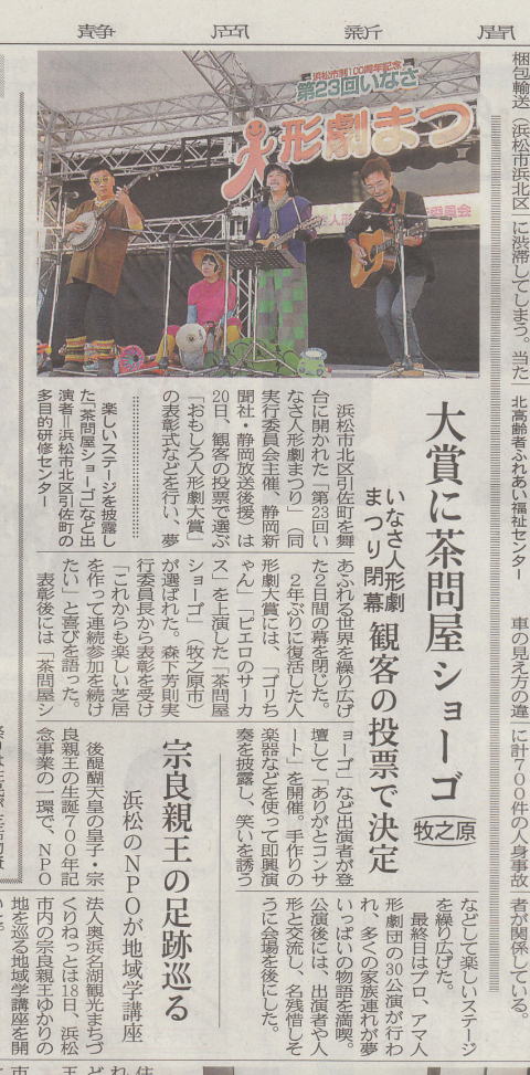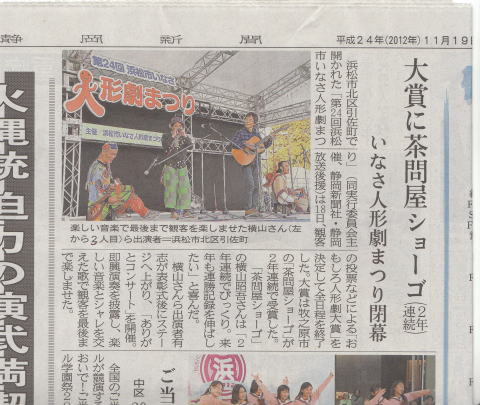 | いなさ人形劇まつりにて「おもしろ人形劇大賞」を受賞しました |
