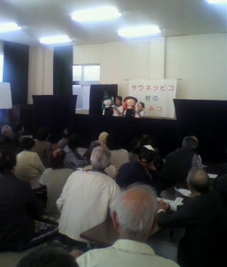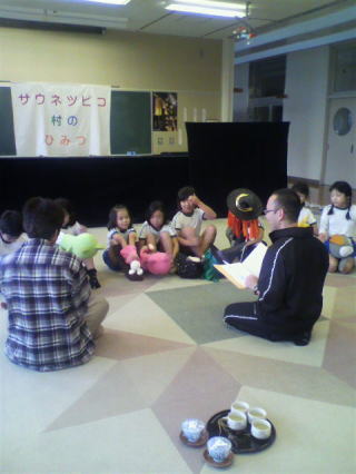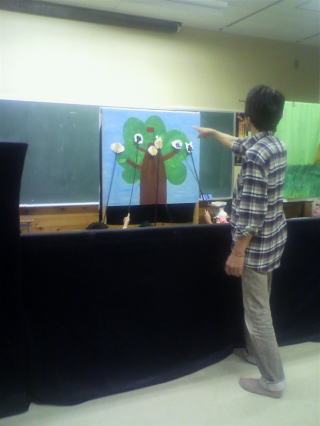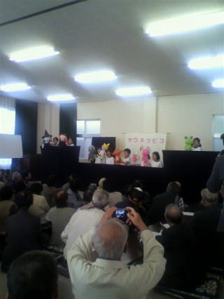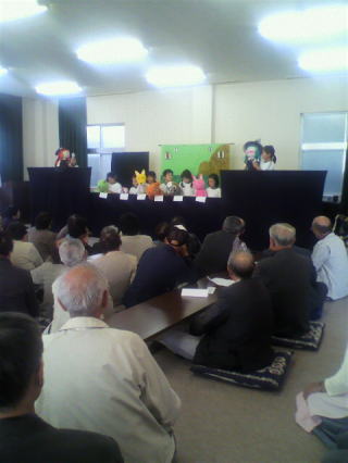 平成25年(2013年)11月11日 毎年恒例、奥山小学校区のお年寄りの会で上演しました 子どもたちはショーゴさんが指導したところを しっかり守って一生懸命演じました おじいちゃんおばあちゃんは、 とても楽しそうに笑ってくれました 練習の時にはなかったお客さんの笑い声 お客さんを前にして 子どもたちは自分たちがやっていることが どんなことなのか、肌で分かったと思います これをお読みの皆さん ぜひ子どもたち(全部で3校)の人形劇を観てください |