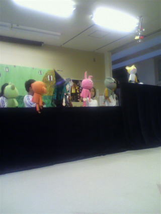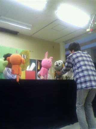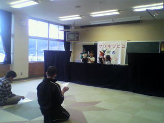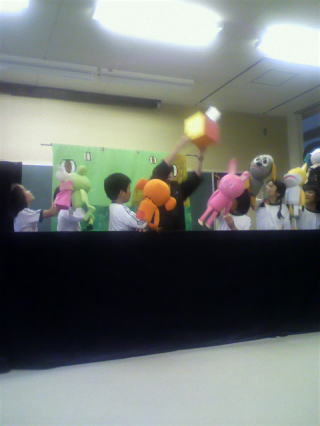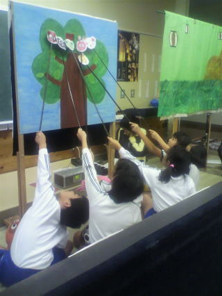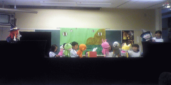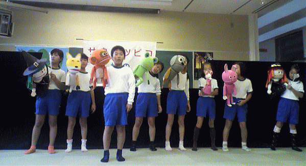 引佐奥山小学校、人形劇クラブの指導をやっています 2013年は「サウネツピコ村のひみつ」 クラブ員の半分は昨年も人形劇クラブ員でした みんな大きな声で演技します (右は クラブ担当の先生です) |