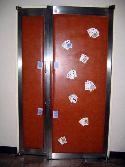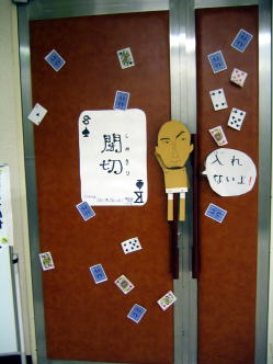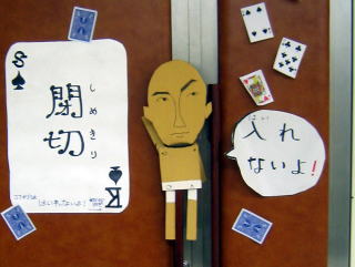 | エレベーターを降りると入り口の案内ポスターが・・・ 「入れないよ」と言っているのは6Fプロデューサー |