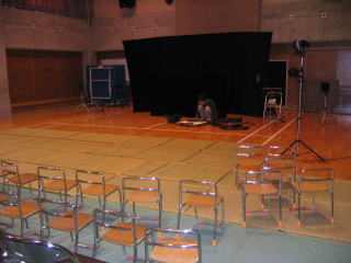 | 微妙な音を調整中 座席の準備は整いました | 会場の後ろには新茶の旗が・・・ | |