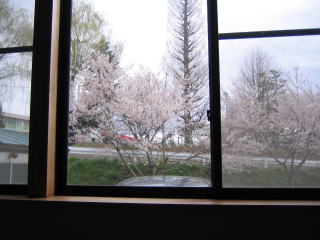| 会場の外は桜が満開 | 開演前にスタッフのみなさんと打ち合わせ | |