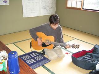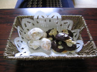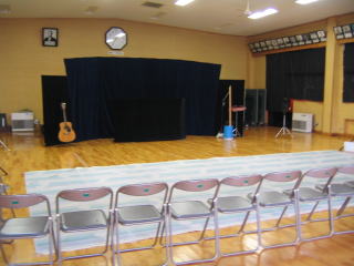 | 控え室でギターの音を調整中 | テーブルには手つくりのお菓子 | |