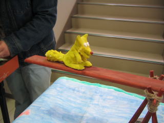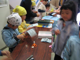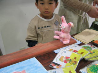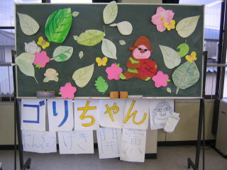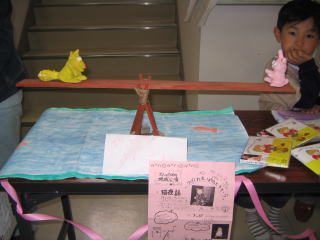 | 打ち合わせどおり皆さん大活躍中 | 次回例会「ゆらゆらばしのうえで」の予告 手つくりの作品が並んでいます |